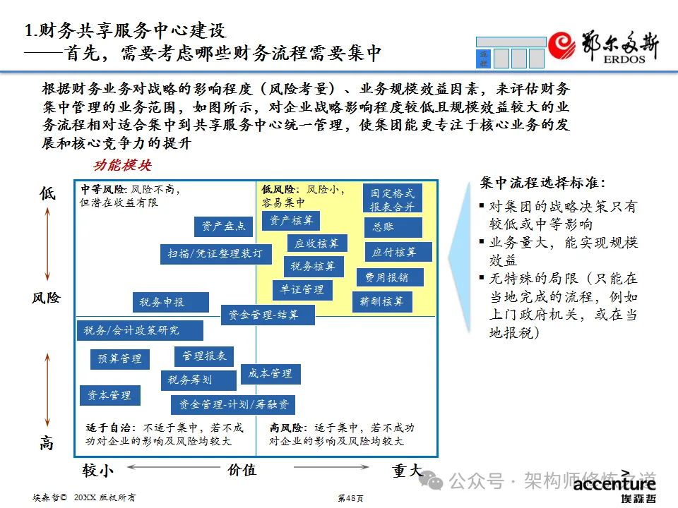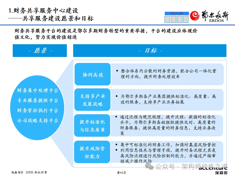 鄂尔多斯集团计划建立财务共享服务中心,集中处理集团的会计核算和资金支付业务。通过标准化的流程和自动化系统,提高核算效率,降低操作风险,同时释放财务人员的精力,使其能够更多地参与到财务管理工作中。