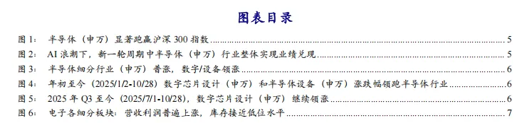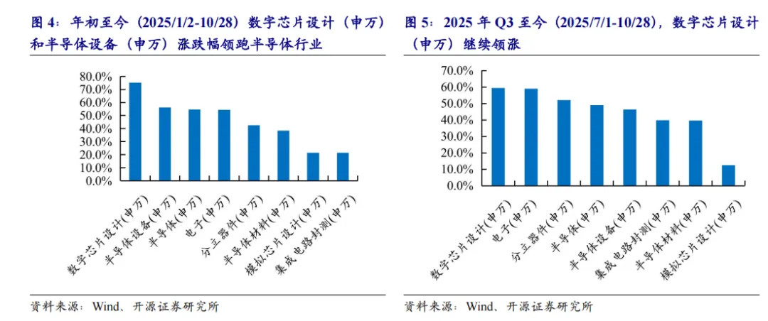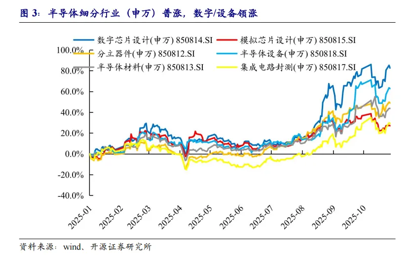 海外政策冲击预期落地至今(2025/4/30-10/28),数字芯片设计(+59.5%)、电子(+59.1%)、分立器件(+52.1%)、半导体(+49.1%)、半导体设备(+46.3%)、集成电路封测(+39.9%)、半导体材料(+39.6%)、模拟芯片设计(+12.4%)。