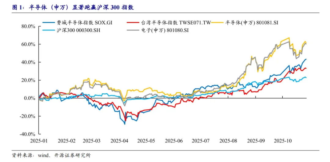 2025年年初至今(2025年10月28日),国内电子(申万)与半导体(申万)在“国补刺激+AI算力+国产替代”等因素驱动下显著跑赢沪深300,电子(申万) 与半导体(申万)累计涨幅分别达到54.46%/54.51%。海外方面,费城半导体指数与台湾半导体指数在2025Q1受到海外政策、关税不确定性以及AI芯片库存调整等因素扰动回撤;4月以后随“政策冲击落地+AI飞轮成型+流动性修复”三重因素共振实现触底反弹;2025Q2-Q3海外算力链持续走强(云厂Capex超预期+AI链核心公司密集合作协议),叠加存储新一轮上涨周期开启,整体势头强劲。年初至今费城半导体指数和台湾半导体指数涨幅分别为44.5%/31.4%。