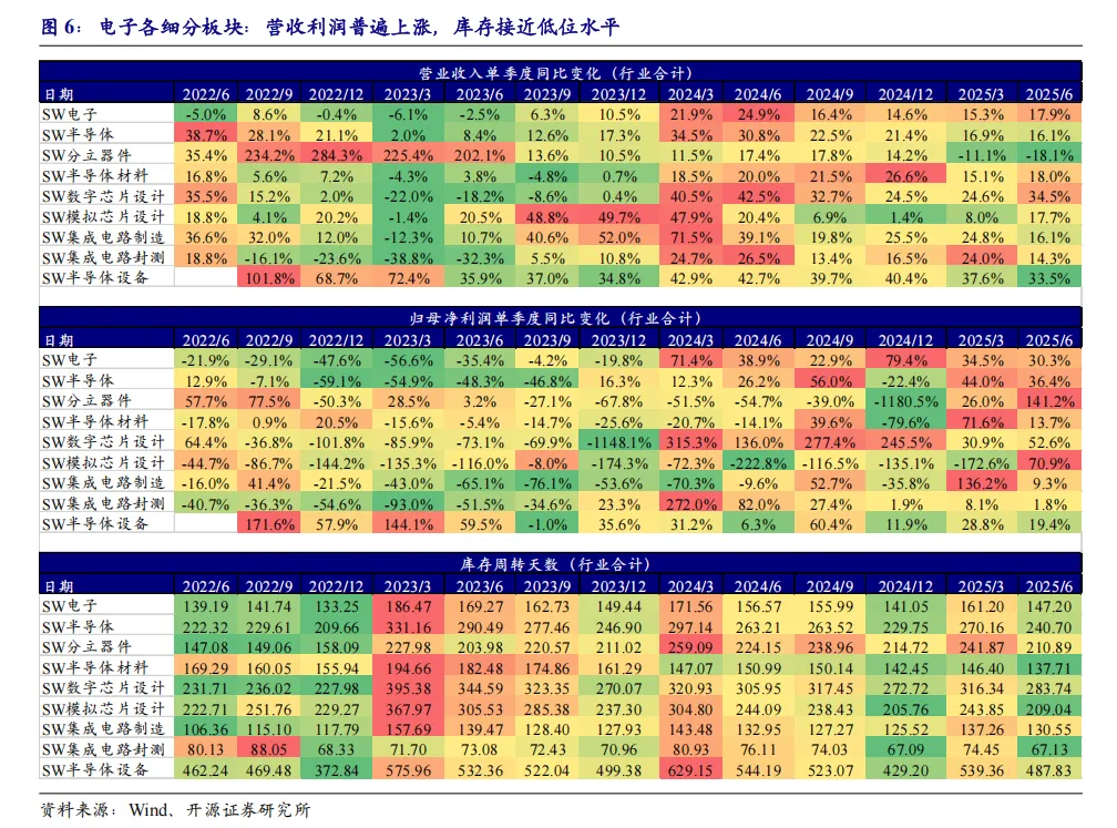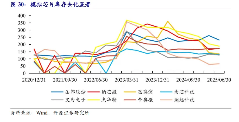 全球半导体周期在2025年进一步复苏,受下游汽车电子、工业及消费电子需求回暖,分立器件板块利润得到修复,模拟芯片设计迎来从“量的恢复”到“利润转正”的拐点。库存周转天数方面,分立器件和模拟芯片设计等板块已接近历史低位水平,价格修复和新的料号导入或进一步延续行情。