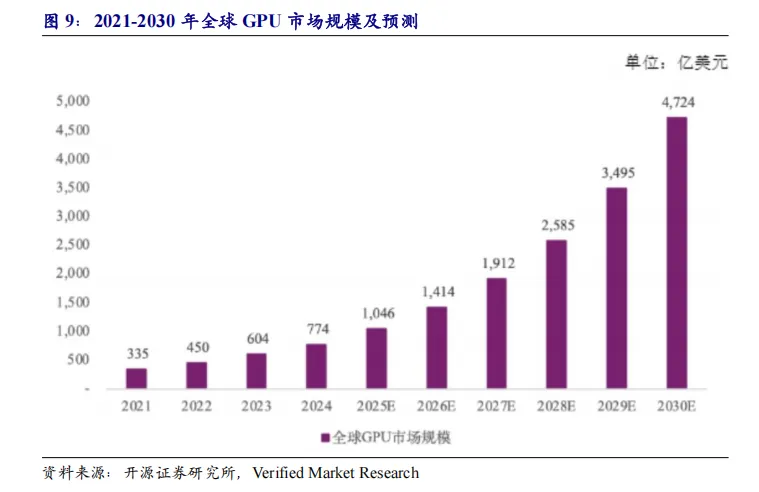 生成式AI(如ChatGPT、DeepSeek)训练与推理需求激增,推动加速服务器及配套网络设施投资。2026财年第一季度英伟达数据中心业务收入同比增长69%至441亿美元,印证AI算力需求高速增长。根据Verified Market Research的数据,2024年全球GPU市场规模为773.9亿美元,2030年有望达到4,724.5亿美元,2024-2030年的复合增长率高达35.19%,呈现强劲的增长态势。