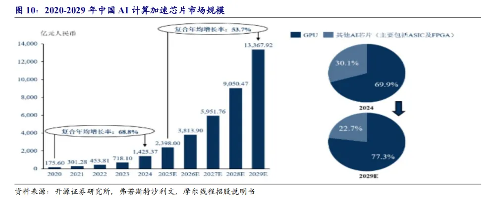根据中商产业研究院数据,2024年中国GPU市场规模约为1,073亿元,同比增长32.96%。自deepseek推出以来,中国人工智能市场经历快速的发展,AI芯片市场规模快速爆发。未来,随着中国GPU企业在技术上的不断突破,AI计算加速芯片的市场规模预计将实现快速增长。根据弗若斯特沙利文预测,到2029年,中国的AI芯片市场规模将从2024年的1,425.37亿元激增至13,367.92亿元,2025年至2029年期间年均复合增长率为53.7%。伴随国家政策大力扶持、国内人工智能产业链各重要环节技术的不断成熟,国产AI芯片厂商将迎来关键发展机遇,进口替代迫在眉睫。
