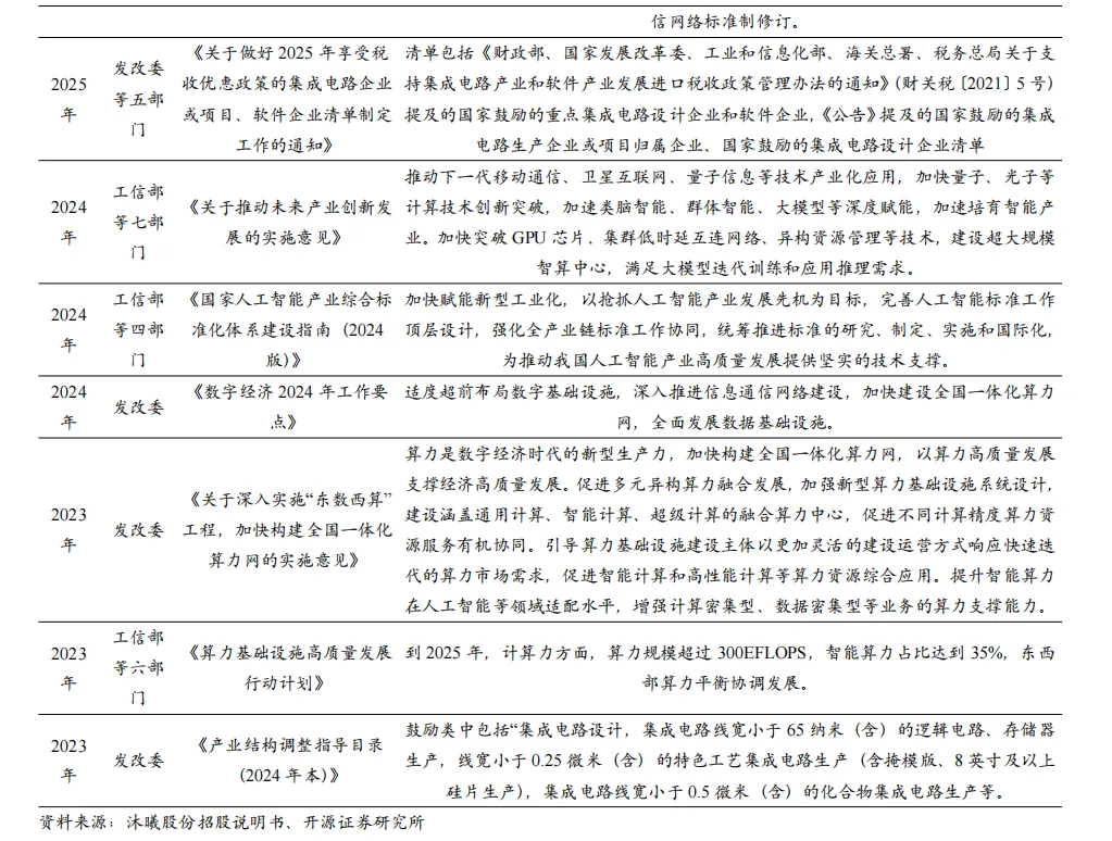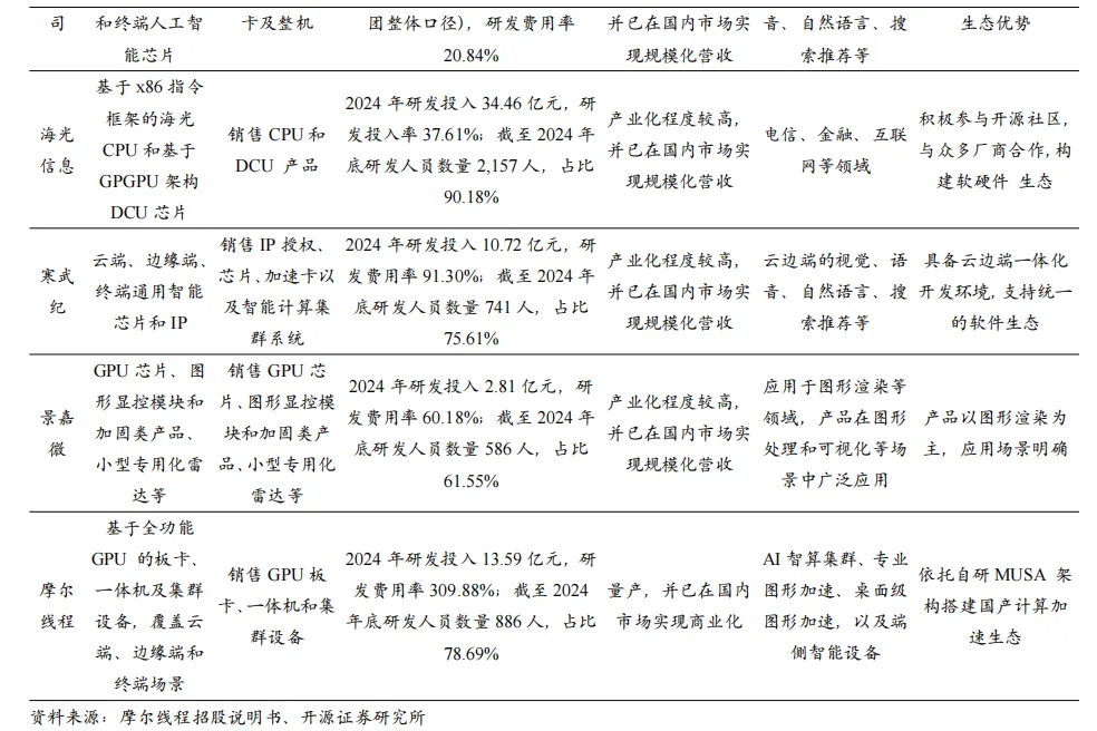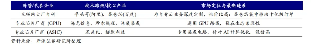 (1) AI算力芯片:GPU/ASIC等云测AI芯片从华为、寒武纪、海光信息等“三分天下”,到沐曦股份、摩尔线程等公司一起“群雄逐鹿”;随着终端AIoT应用场景井喷,端侧SoC厂商乘风起。