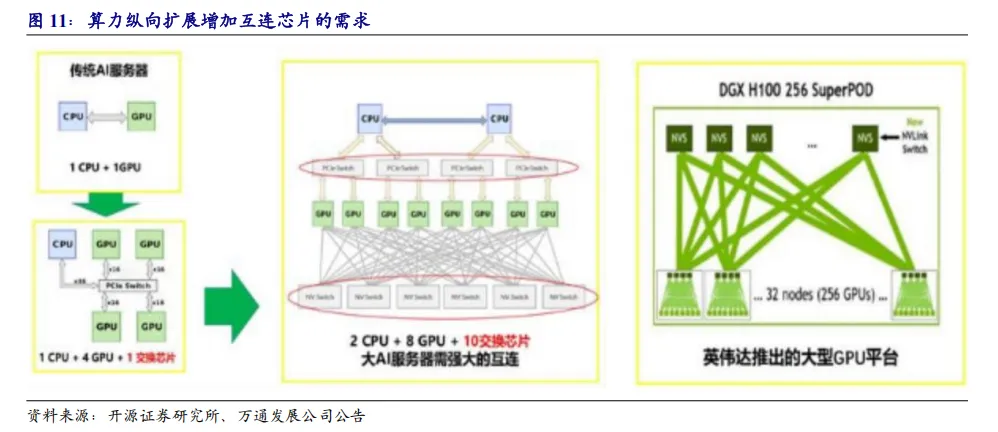 (3) AI运力芯片:超节点+大集群推动运力市场规模迅速提升,Scale-up 交换芯片已成为数据中心主力交换需求,并且持续增长。目前交换芯片国产化率极低,有望成为下一个高赔率的国产替代新方向。