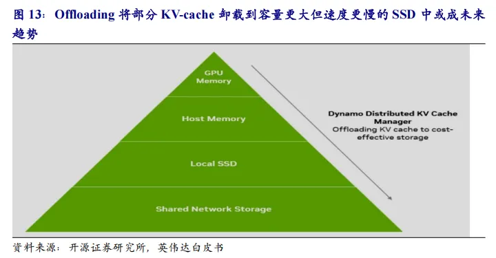 2.Offloading将部分KV-cache卸载到容量更大但速度更慢的SSD中或成未来趋势。随着 AI 需求的增长,在固定预算下,仅依靠 GPU 内存进行键值缓存已无法满足 SLA 的要求。参照英伟达Dynamo KV Cache Manager技术文档,其支持将较旧或访问频率较低的KV cache卸载到更经济高效的内存和存储解决方案(例如 CPU 内存、本地存储或网络对象存储或文件存储)。此功能使通过将KV cache卸载到其他内存层级结构,释放宝贵GPU资源,同时仍保留和重用历史KV cache,从而降低推理计算成本。