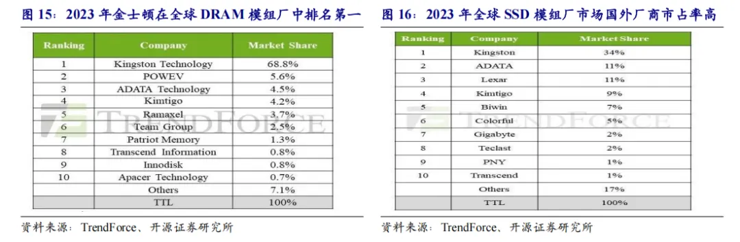 存储模组国产化空间广阔。内存模组方面,据 TrendForce 集邦咨询数据,2023 年全球 DRAM 内存模组市场整体营收达125亿美元,同比出现28%下滑,其中前十大 DRAM 模组厂占据了 93%的产业整体营收。固态硬盘(SSD)方面,根据TrendForce 集邦咨询数据, 2023 年自有品牌渠道通路市场全球出货营收前十的固态硬盘模组厂,在这份榜单中大陆品牌占五席,但是主要的市场份额依然由海外龙头模组厂占据。