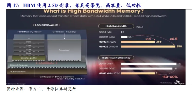 HBM是目前主流的近存计算方案。近存计算利用先进的封装技术,将计算逻辑芯片和存储器封装到一起,通过减少内存和处理单元之间的路径,实现高I/O密度,进而实现高内存带宽以及较低的访问开销。近存计算主要通过2.5D、3D堆叠等技术来实现,广泛应用于各类CPU和GPU上。HBM采用TSV技术堆叠DRAM die以大幅提升I/O数,再配合2.5D先进封装制程,在维持较低内存频率的同时达到更显著的总通道宽度提升,兼具高带宽、高容量、低功耗,是目前广泛应用于高性能计算、数据中心等领域的近存计算架构。