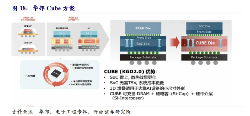 除HBM外,以华邦为首的Cube方案有望在端侧算力中大放异彩。云端算力下放到边缘端,可以让边缘侧的响应速度更快且更安全。在这一背景下中国台湾存储厂商华邦推出了CUBE方案。CUBE采用2.5D或3D封装,与主芯片SoC集成,通过高达1024个I/O实现超高带宽,可广泛适用于适用于可穿戴设备、边缘服务器设备、监控设备及协作机器人等高级应用。从CUBE的结构来看,是将SoC裸片置上,DRAM裸片置下,省去SoC的TSV工艺。当SoC裸片和DRAM裸片堆叠的时候,相比于传统的引线键合(Wire Bonding),微键合(Micro Bonding)可以将1000微米的线长缩短至40微米,仅有传统长度的2.5%。在未来的混合键合(Hybrid Bonding)封装工艺下,线长甚至可以缩短至1微米。从芯片内部来看,信号所经过的传输距离更短,因此功耗可相应地降低。