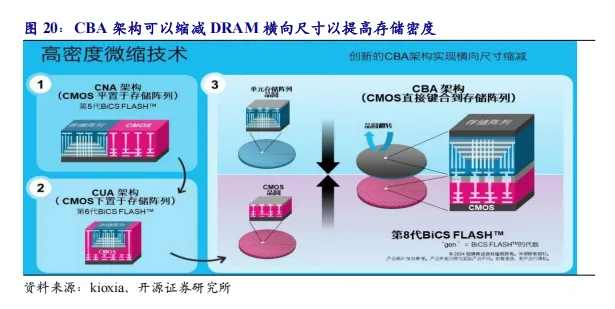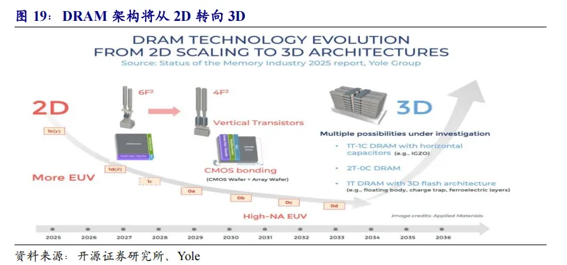 DRAM架构将从2D转向3D。3D DRAM是一种通过堆叠多个存储层和使用垂直互联技术来增加存储密度和性能的先进DRAM技术。3DDRAM能够提供更高的存储密度、更低的功耗和更高的带宽,适用于高性能计算、数据中心和AI等应用场景。3D DRAM 将存储单元堆叠在逻辑单元上方,以增加单位面积的容量,并解决平面DRAM的深窄电容难题。3D堆叠还可以实现跨层存储电容器的重复使用,从而有可能降低单位成本。未来采用垂直晶体管(VT)构建的4F² DRAM单元,以及CMOS键合阵列(CBA)技术将成为3D-DRAM的主流方案。在CBA方法中,存储器阵列和外围电路在单独的晶圆上制造,并使用先进的混合键合或熔融键合技术进行键合。