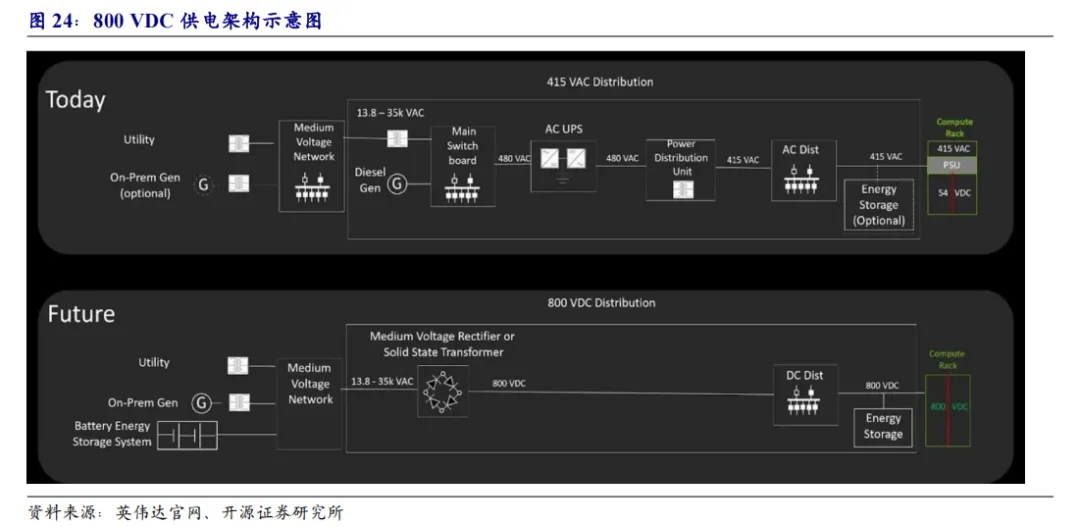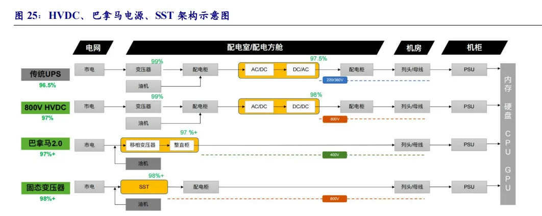除HVDC外,巴拿马电源及SST方案亦有望成为AIDC电力架构发展方向:巴拿马电源:巴拿马电源柔性集成了10kVac的配电,隔离变压,模块化整流器和输出配电等环节,采用移相变压器取代工频变压器,并从10kVac到240V dc整个供电链路做到了优化集成。该方案,具有高效率,高可靠性,高功率密度,高功率容量,兼维护方便等特点。相比传统数据中心的供电方案,占地面积减少50%,其设备和工程施工量可节省40%,其功率模块的效率高达98.5%,架构简洁可靠性高。蓄电池单独安装,系统容量可以根据需求进行灵活配置。