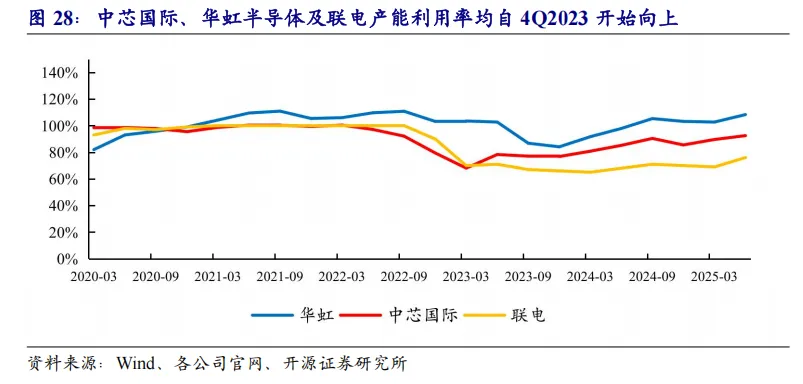 成熟制程产能已逐步实现向中国大陆转移,在本轮AI浪潮下,算力产业链蓬勃发展,本土先进制程与先进存储开始新一轮扩产。2025Q1和Q2,半导体设备行业在“扩产、替代、订单兑现”的三重红利下,收入均创历史同期新高,分别同比增长37.6%和33.5%。与此同时,制造端稼动率高企,先进封装也迎来自主可控新窗口,材料收入稳步提升,国产渗透加速。