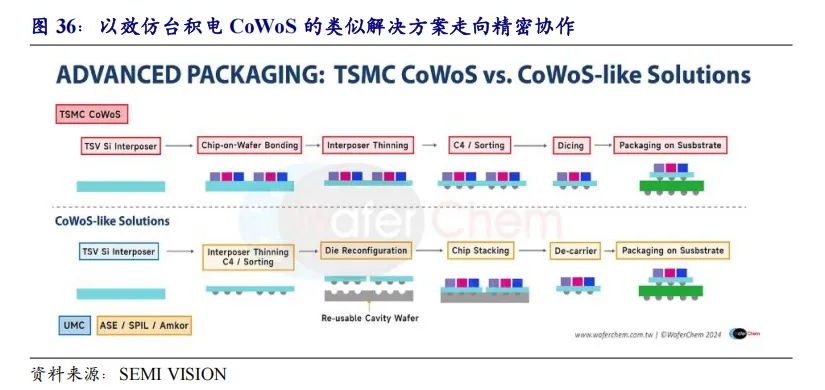 从技术破局的视角:其一,以盛合晶微、长电科技、通富微电为代表的国产封测厂商已具备2.5D封装等高端封装技术实力。其二,台积电的初代CoWoS采取65nm制程,在此节点国产设备等配套已基本成熟。其三,CoWoS封装分工合作的范式下,虽然硅中介层制造仍依赖中芯国际产能,但封测厂商在高端先进封装环节的参与度提升,为高端先进封装突破放量积累know-how。