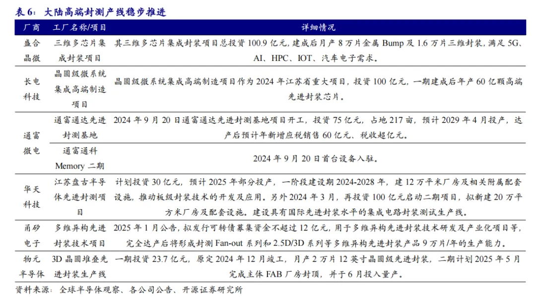 大陆方面,在当前我们认高端先进封装同制造端类似,同属于国产AI算力供给端破局的关键。但相比制造端,大陆封测环节与海外的差距更小,且突破路径清晰: