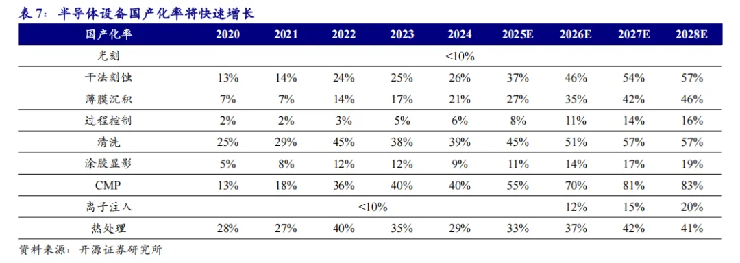 我们认为,干法刻蚀、薄膜沉积及CMP或将成为未来4年国产化率迅速提升的领域。同时光刻、量检测设备及离子注入设备和涂胶显影设备也有望逐步突破。此外配套的材料、EDA、IP等环节也有望加速发展。