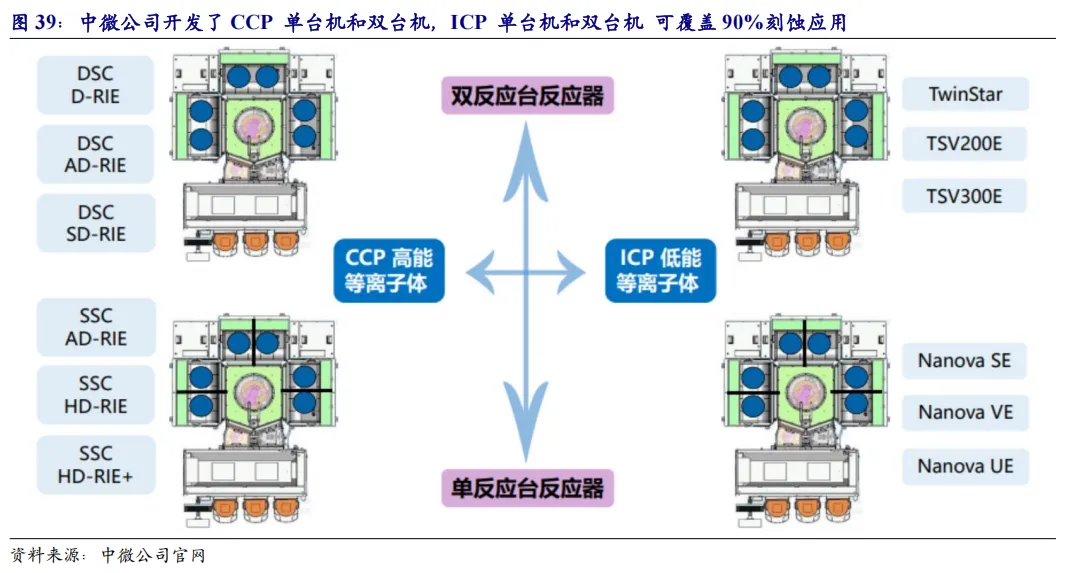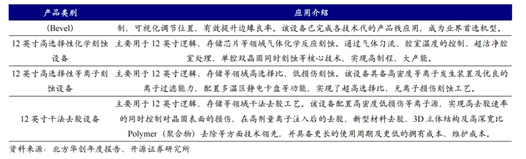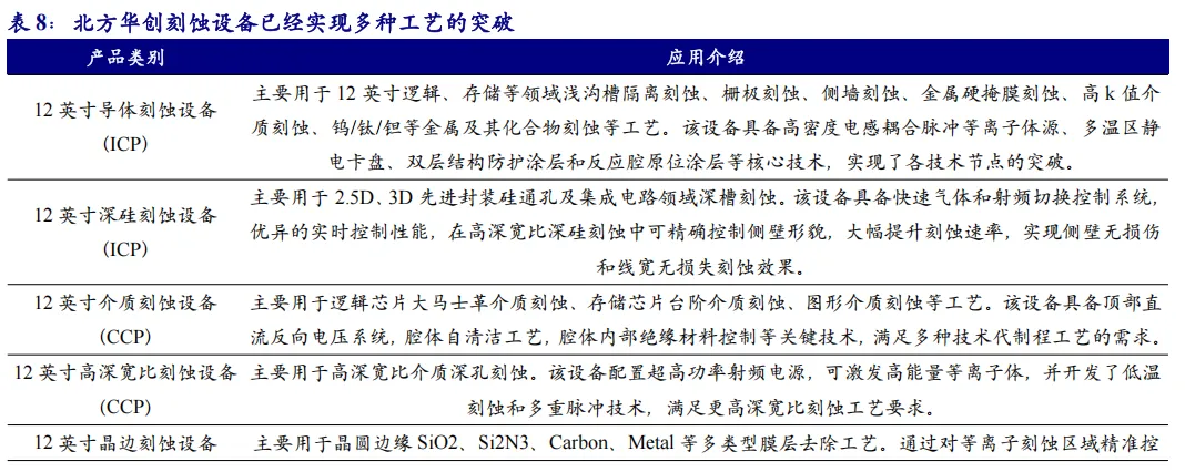 北方华创在刻蚀设备领域,已形成了 ICP、CCP、Bevel 刻蚀设备、高选择性刻蚀设备和干法去胶设备的全系列产品布局。2024 年公司刻蚀设备收入超 80 亿元。其中在ICP方面,北方华创已经推出NMC612E 是用于12英寸硅片的等离子体干法刻蚀设备,适用于关键技术节点的逻辑芯片硅刻蚀工艺,关键技术节点的3D-NAND硅刻蚀和台阶刻蚀工艺,以及关键技术节点 DRAM制程中的导体和金属掩膜刻蚀工艺,适用于浅槽隔离刻蚀、栅刻蚀、侧墙刻蚀、自对准多重图形化曝光、钨刻蚀等工艺。在针对高深宽比刻蚀方面,北方华创推出的NMC612D应用于12英寸干法刻蚀工艺,针对Logic、3D NAND、DRAM以及Power等领域。主要应用为浅沟槽隔离刻蚀,栅极刻蚀、侧墙刻蚀等制程,具有丰富的工艺调试手段、较高的刻蚀均匀性以及量产稳定性。