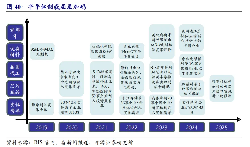 自2018年中美贸易战爆发后,美国开始以“国家安全”为由限制对华技术出口。2019年,美国将华为、中科曙光等中国科技企业列入“实体清单”,限制其获取美国技术。2022年8月,拜登政府签署《芯片与科学法案》,明确限制获得补贴的企业在中国投资先进制程芯片厂。2022年10月,美国商务部工业与安全局发布出口管制新规,首次对A100/H100等高端AI芯片实施出口禁令,标志着美国正式将半导体供应链优势“武器化”。
