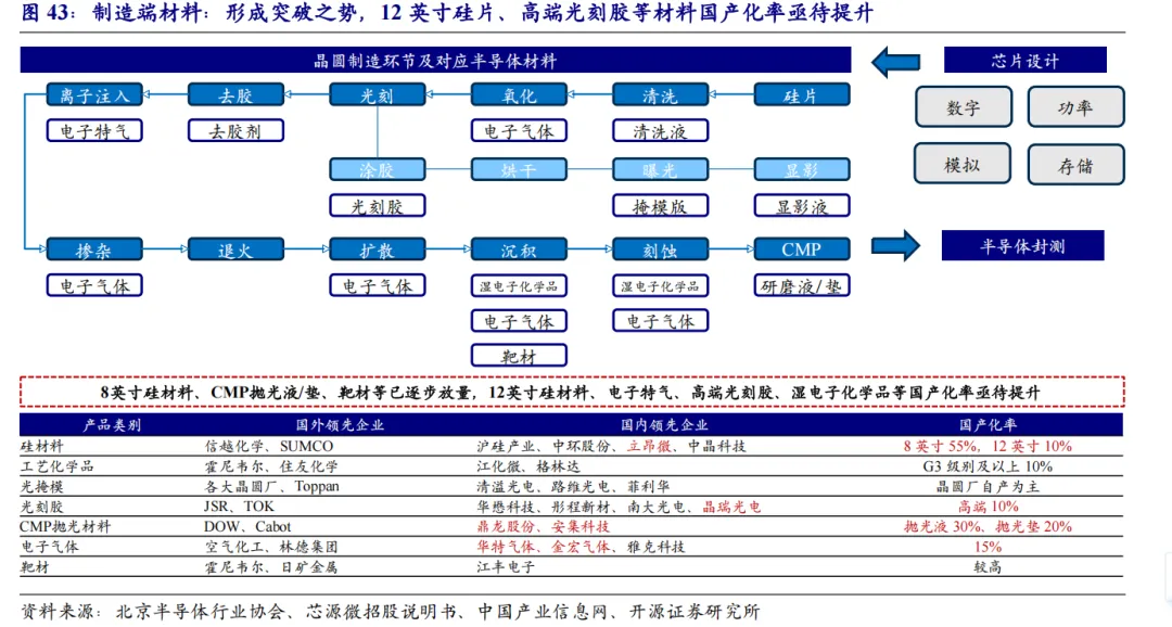 制造端材料方面,经过多年布局,中国企业已在抛光液、抛光垫、靶材、多种电子气体及8英寸硅片等领域取得阶段性成果,部分产品实现量产供货,国产化率稳步提升。然而,在12英寸硅片、光掩模、光刻胶等材料的高端应用领域,国产化率仍处低位,亟待进一步突破技术难关,赢得客户信任并通过认证。