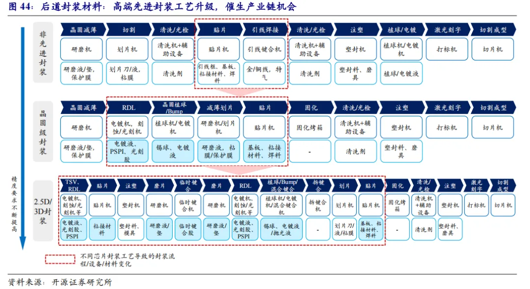 在后道封测材料方面,由二维的传统封装向三维的先进封装发展中,技术路线陆续实现倒装封装,晶圆级封装以及2.5D/3D封装,工艺流程更趋复杂,所需设备/材料的类型也明显增加。