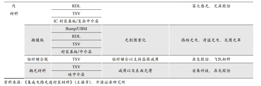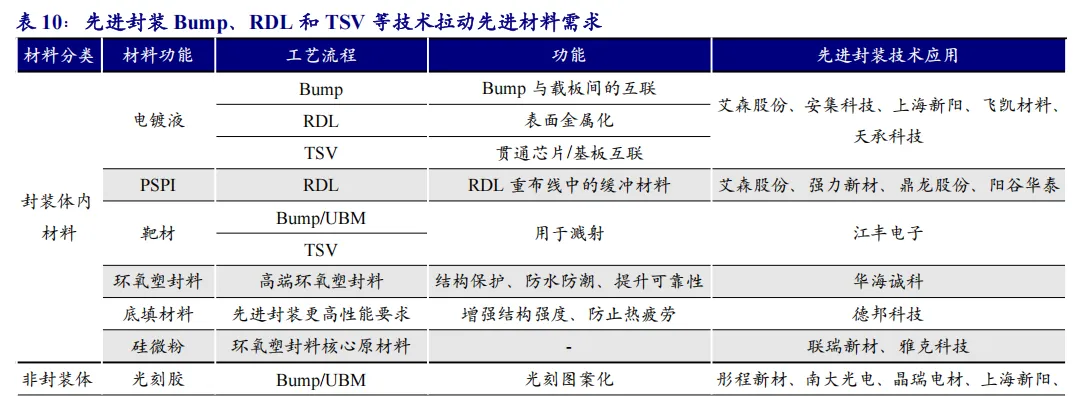 国产先进封装材料正积极推进验证/量产进程。近年来在先进封装材料领域,国内厂商在电镀液、PSPI、光刻胶、掩膜版、抛光材料、环氧塑封料等多个关键环节实现积极进展。部分厂商已实现在主流封测厂稳定供货,同时也有部分厂商的产品获得国内头部芯片设计公司认可,正在加速导入,并进入批量阶段。
