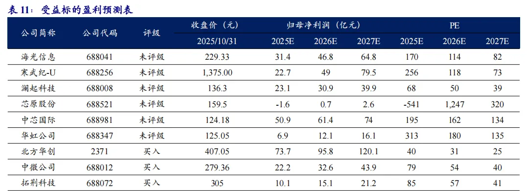 寒武纪:2025年上半年业绩大幅增长,实现营业收入28.81亿元,同比增长4,347.82%。公司实现归属于上市公司股东的净利润为10.38亿元,均实现了扭亏为盈。公司已构建覆盖云端、边缘端、终端的全栈产品体系,满足多样化的AI训练与推理需求。2025年三季报中存货较2025年中报相比增加了近10亿,考虑寒武纪已经进入实体清单,因此可以判断国内先进制程产能供给问题已经得到解决。