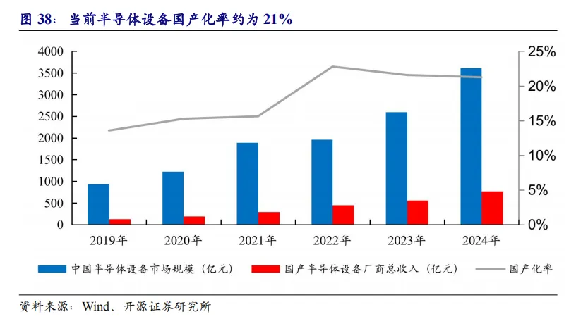 在半导体产业国产化的长期战略下,半导体供应链的国产化率逐渐提高。除光刻机外,目前我国半导体设备大致可满足半导体制造过程中各阶段需求。据TrendForce,24年上半年中国大陆在芯片制造工具上的支出达到创纪录的250亿美元,超过中国台湾、韩国和美国总和。当前中国光刻机国产化率仍不足5%,对应零部件/系统/整机/配套设施亟待突破。
