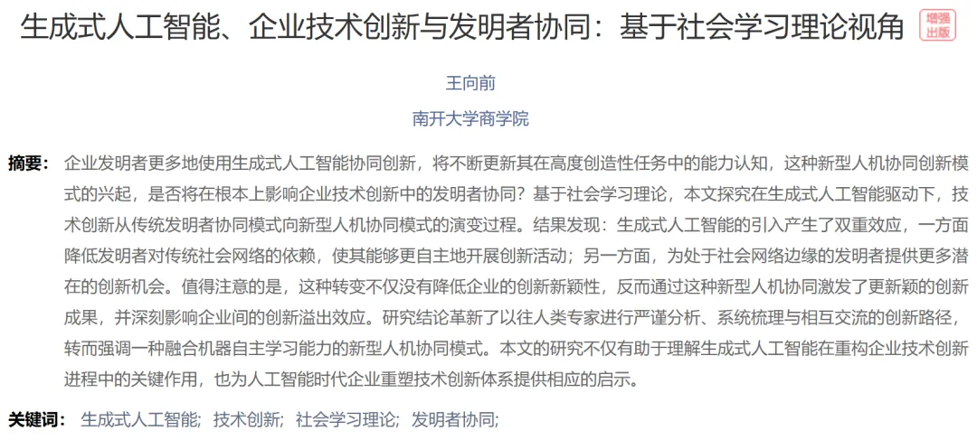 [1]王向前.生成式人工智能、企业技术创新与发明者协同:基于社会学习理论视角[J].经济研究,2025,60(09):156-176.