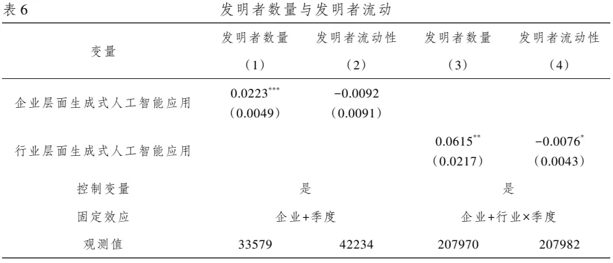 发明者数量显著增加,创新边界拓展带动了对发明者的总需求上升;发明者流动性无显著变化,排除了 “技术替代导致人员流失” 的担忧;发明者创新效率显著提升,按年滚动专利申请量增加,验证了人机协同的效率提升效应。