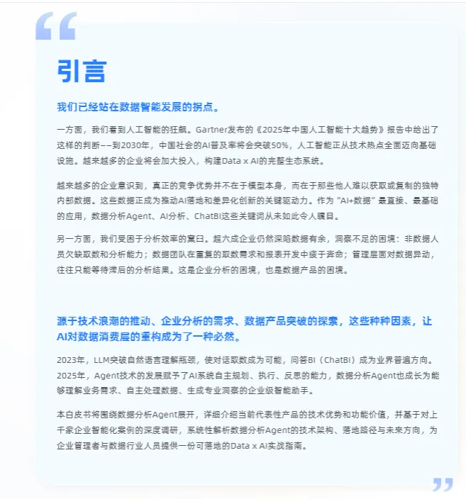 这份集技术解析、产品拆解、案例验证、落地指南于一体的白皮书,既是把握数据分析 Agent 发展机遇的 “导航图”,也是企业解锁数据价值的 “工具箱”。无论你是企业决策者、数据负责人,还是技术开发者、业务分析师,都能从中解锁 AI 驱动数据消费的核心密码。