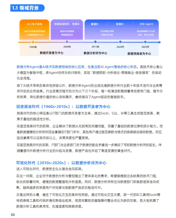 ✅ 发展脉络清晰梳理:从 “数据开发者为中心” 的固定报表时代,到 “数据分析师为中心” 的可视化时代,再到 “数据消费者为中心” 的智能化时代,完整呈现数据分析行业三大阶段演进逻辑。