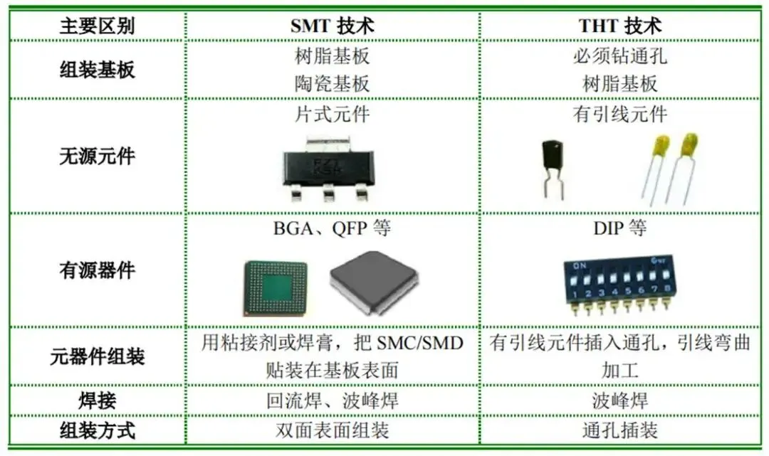从组装工艺技术的角度分析,SMT技术和THT技术的根本区别是“贴”和“插”。两者的差别还体现在基板、元器件、组件形态、焊点形态和组装工艺各个方面,SMT技术和THT技术的主要区别如下所示:
