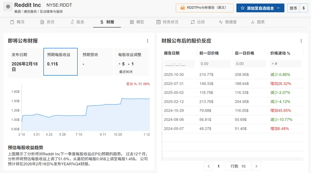 2. 红迪网(Reddit)财报发布日期: 2月18日预计每股收益增长: +240.4%(同比)预计营收增长: +54.5%(同比)