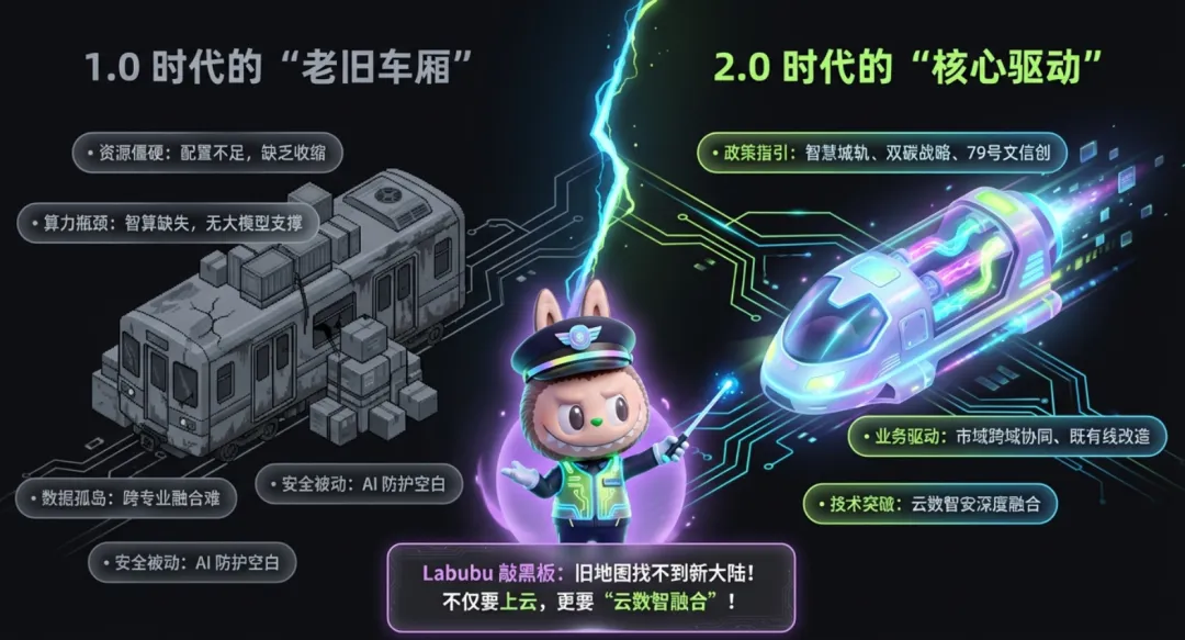 首先来说下核心结论:城轨云 2.0 是1.0的技术升级方案,聚焦智慧、绿色、融合、国创四大方向,通过 “云网数智安” 深度融合架构,解决 1.0 阶段资源配置僵硬、跨域协同弱等问题,构建自主可控、高效智能、安全可靠的城轨数字化底座,支撑多制式轨道交通全业务场景升级。