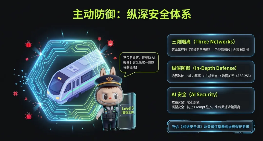 大数据平台:三级架构(企业级 + 三域共享级 + 应用独享级),覆盖数据全生命周期管理; 人工智能服务平台:分层架构(基础设施 + 模型平台 + 模型层 + 应用开发层),支撑全流程 AI 服务; 通信网络:含安全生产网、内部管理网等多网域,适配智算网络差异化需求; 安全架构:遵循 “平台统保 + 系统自保” 方针,覆盖硬件、数据、模型、应用全维度防护;