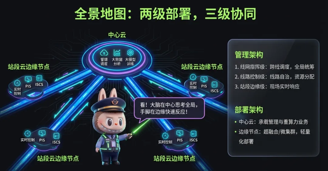 采用 “云边端协同” 一体化体系,涵盖综合运管层、IaaS 层、PaaS 层、SaaS 层、站段云边缘节点层、通信网络层、全域安全防护,实现全链路覆盖。