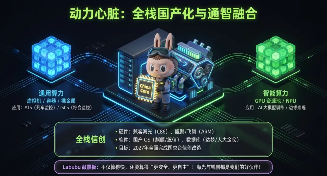 国产化体系:覆盖硬件(服务器 / 芯片)、软件(操作系统 / 数据库)全栈适配;