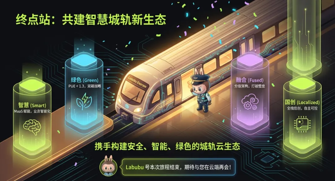 绿色化转型:降低数据中心 PUE,减少能耗与碳排放; 融合化突破:打破系统壁垒,支撑跨域、多制式协同运营; 自主化保障:构建全栈国产化体系,规避供应链风险; 生态化重构:推动技术、业务、产业协同发展,助力城轨高质量升级。