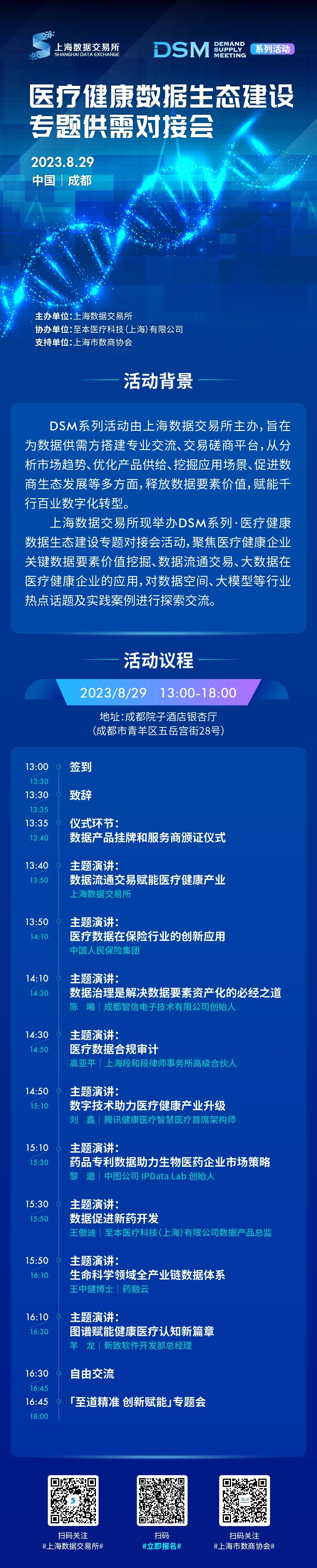 为加速医疗健康数据价值的释放、驱动数据要素在医疗健康领域的应用,上海数据交易所将于8月29日在四川成都举办DSM系列活动——医疗健康数据生态建设专题供需对接会。
