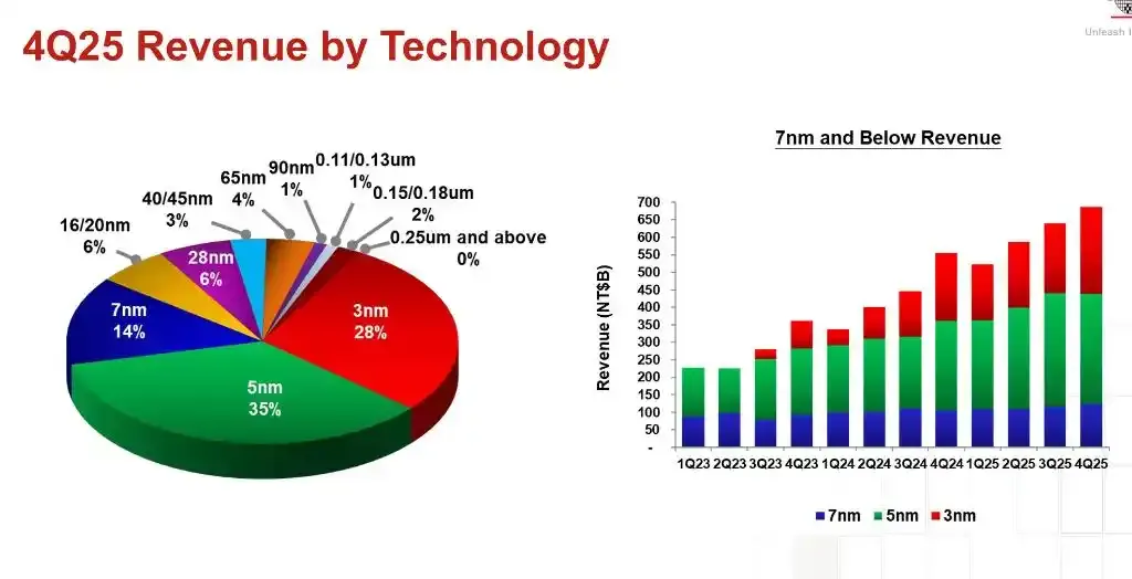 业务结构层面,先进制程主导地位进一步强化。Q4 7nm及以下先进制程占晶圆收入的比例提升至77%,其中3nm制程收入占比28%,5nm占比35%,7nm占比14%。