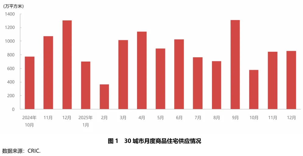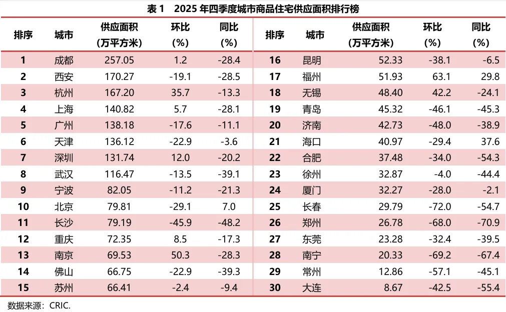 2025年四季度,监测的30座重点城市商品住宅新增供应面积2279.94万平方米,较上季度减少18.1%,较去年同期减少27.8%。其中一线城市供应总面积490.54万平方米,较上季度减少7.6%,较去年同期减少17.0%;二、三线城市供应总量1789.40万平方米,较上季度减少20.5%,较去年同期减少30.3%。季度内各月供应量较去年同期均有明显回落,12月跌幅最大,减少34.5%。在行业高质量发展导向下,供应端主动收缩优化供求关系,并改善供应结构推动“好房子”建设,未来供应减少的趋势仍将持续,企业更加注重项目的精准性和质量提升。