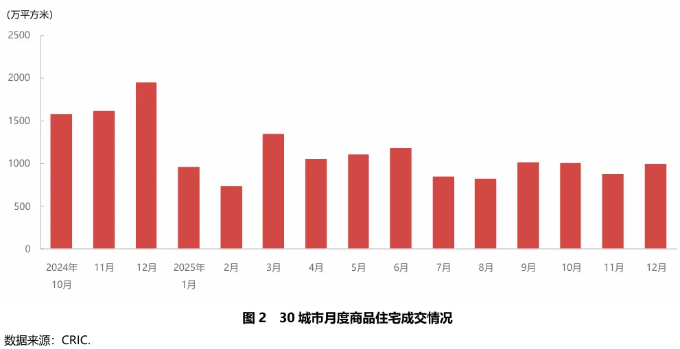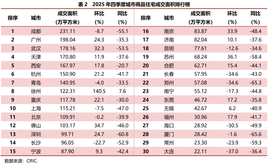 2025年四季度,监测的30座重点城市商品住宅成交面积总量2857.68万平方米,较上季度增加6.9%,较去年同期减少44.3%。其中一线城市成交总量522.86万平方米,较上季度增加10.3%,较去年同期减少45.6%;二、三线城市成交总量2334.82万平方米,较上季度增加6.2%,比去年同期减少44.0%。季度内各月成交量相对平稳,北京、上海、杭州、武汉、南京等部分城市在政策利好和年末销售节点支撑下,12月成交量前两月提升。与去年同期相比,各月成交量跌幅明显,且逐月扩大,12月跌幅近五成。同比跌幅明显的主要原因是上年四季度成交放量,为全年峰值,基数较大;另一方面依然是市场需求持续收缩,下行趋势不可避免。