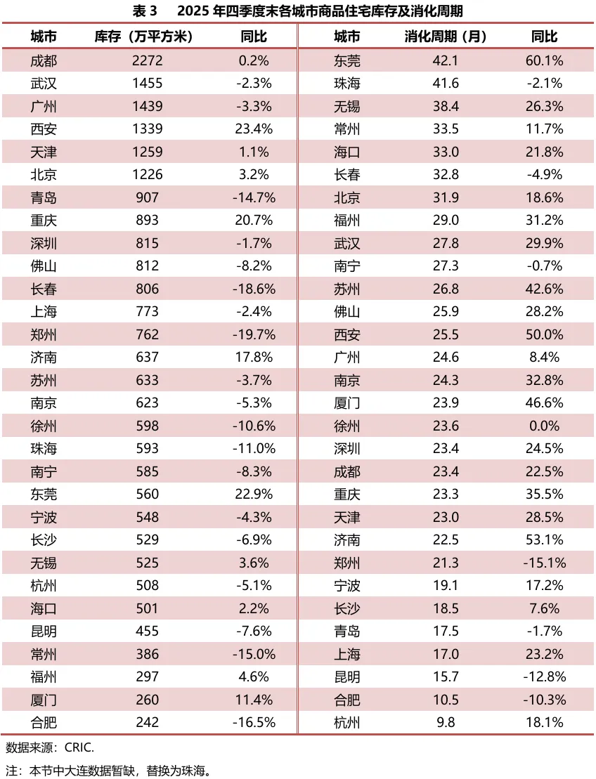 四季度末,监测的30座重点城市中,成都商品住宅库存明显高于其他城市,为2272万平方米,合肥库存面积最小,为242万平方米。与去年相比,11座城市库存增加,西安、东莞、重庆涨幅居前,在20%—24%之间;19座城市库存减少,郑州、长春去化相对明显,同比跌幅近两成,合肥、常州等5座城市跌幅在10.6%—16.5%之间。
