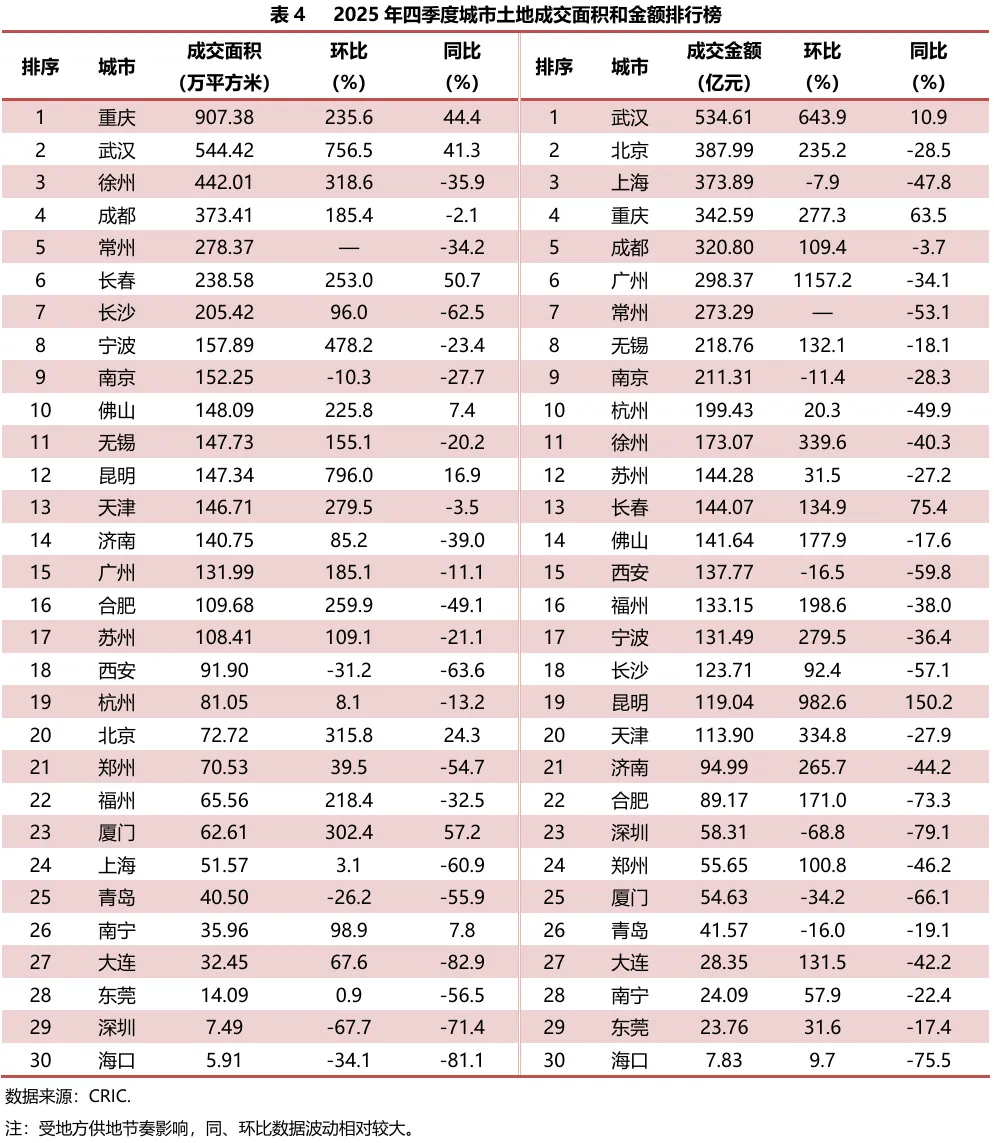 具体城市来看,四季度重庆土地成交面积领先,超过900万平方米,其次武汉、徐州、成都在373万—545万平方米之间,其他成交规模前十的城市面积在148万—280万平方米之间。与上季度相比,25座城市成交面积增加,多数城市呈倍数增长;5座城市环比减少,深圳跌幅居前,海口、西安也有明显跌幅。与去年同期相比,8座城市成交面积增加,厦门、长春、重庆、武汉涨幅明显;22座城市同比减少,其中9座城市跌幅超过五成,大连、海口跌幅超过八成。