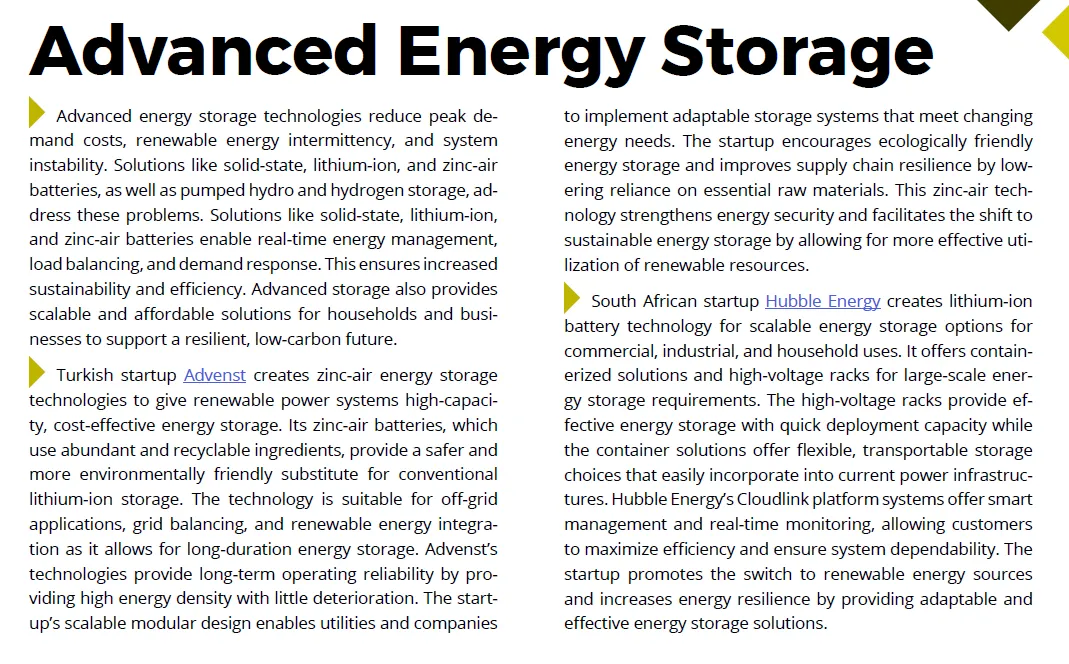 先进储能:土耳其 Advenst(锌空气储能技术)、南非 Hubble Energy(锂 - ion 电池储能方案)