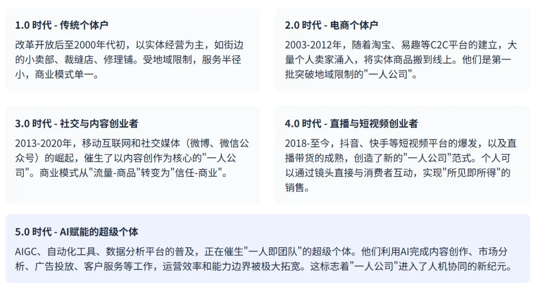 5.0 时代 - AI赋能的超级个体 (2023 - 未来): AIGC、自动化工具、数据分析平台的普及,正在催生“一人即团队”的超级个体。他们利用AI完成内容创作、市场分析、广告投放、客户服务等工作,运营效率和能力边界被极大拓宽。一个设计师可以用AI生成海量设计方案,一个营销人员可以自动化管理复杂的营销流程。这标志着“一人公司”进入了人机协同的新纪元 [[21]]。