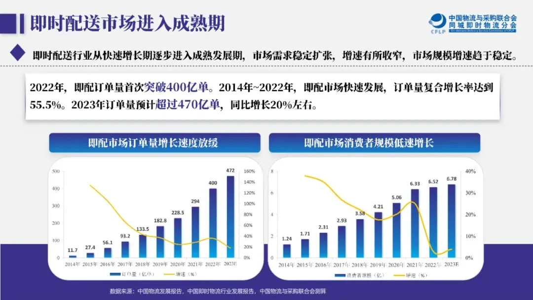 运力服务商是即时配送行业的重要建设者。2023年,即时配送行业继续保持增长,市场规模增速趋于稳定。预计2023年订单量超过470亿单,同比增长20%左右。即时配送行业开始由高速增长期逐步进入成熟发展期。餐饮外卖仍是支撑即配行业发展的重要底盘业务;而以即时零售为代表的新零售的发展则为即时配送行业提供了更广阔的增量空间,即时配送构筑了即时零售履约基础,推动了即时零售业务发展, 用“万物皆可送”支撑了即时零售的“万物皆可买”。同时,作为就业“蓄水池”和“稳定器”,即时配送行业在促进就业容量扩大,带动就业能力增强,助力就业质量改善,确保就业大局稳定等方面继续发挥着显著的社会效益。