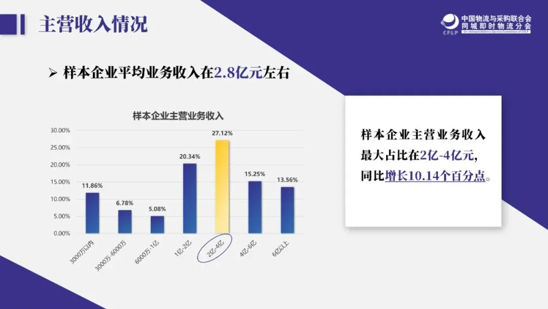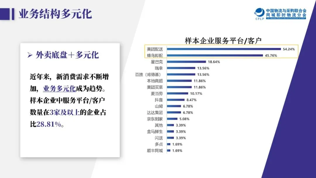 在这份报告中,样本企业平均业务收入在2.8亿元左右。随着新消费需求的崛起,运力服务商在传统外卖业务基础上开始进行多元化探索,调查显示,样本企业中服务平台/客户数量在3家及以上的企业占比28.81%。此外,样本企业资金压力均有所下降。