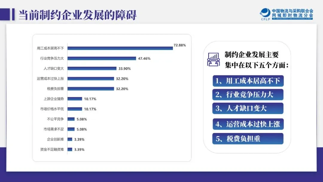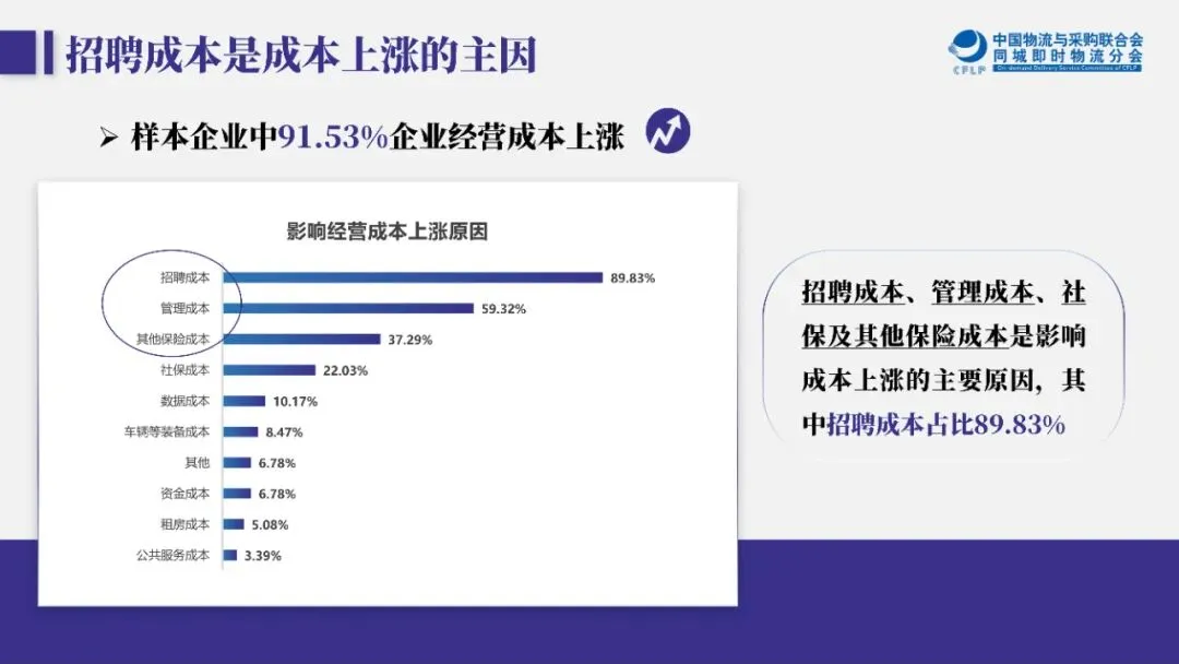 报告还显示,企业在经营发展过程中,“用工成本居高不下”、“行业竞争压力大”、“人才缺口变大”、“运营成本过快上涨”、“税费负担重”是制约企业发展的主要障碍。在运营成本方面,样本企业中91.53%企业经营成本上涨,其中89.83%企业认为招聘成本是影响经营成本上涨的原因。调查显示,企业仍以网络招聘、第三方人力资源公司等传统招聘方式为主。