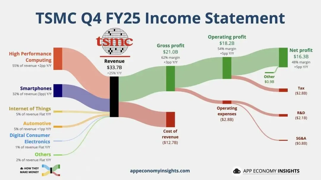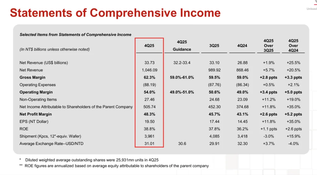 具体来看,台积电2025四季报主要财务数据如下:
