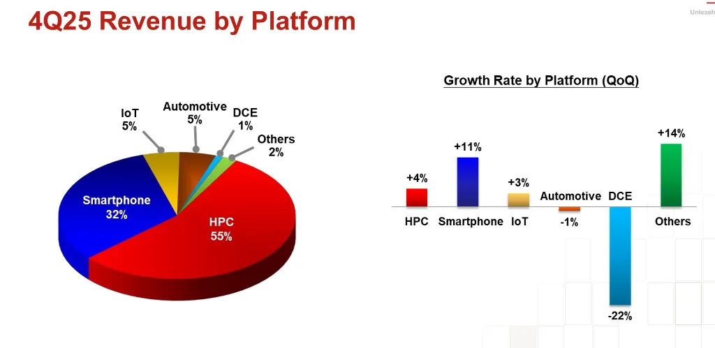 各个平台业务情况:高性能计算HPC占比55%,智能手机32%,二者占比87%,持平第三季度;与上一季度相比,HPC收入环比增4%,智能手机环比增11%,显示智能手机出货拉动高端制程,AI芯片势头放缓。