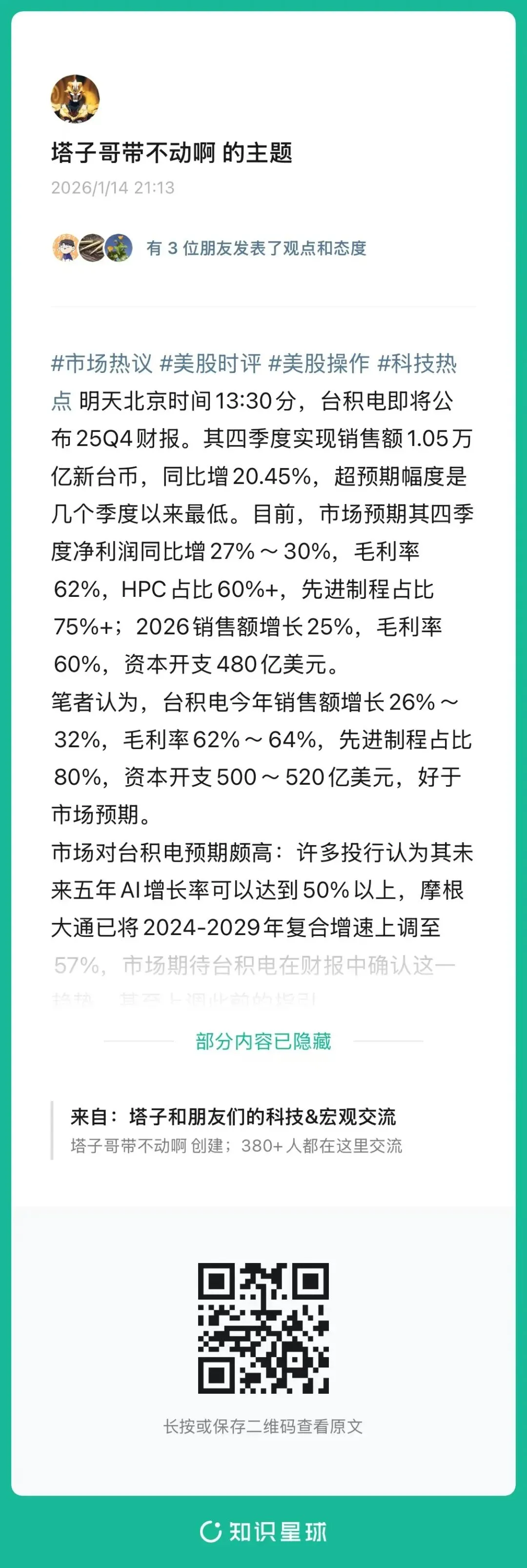 笔者认为台积电本季度财报基本符合预期,但由于指引和开支强劲,使得市场对未来乐观预期改善,行业个股大幅攀升。
